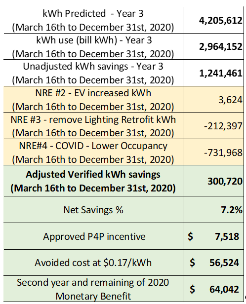 Applying NRA Method #10 ("Engineering Calculation") in a conservative way allowed us to quantify the extra kWh due to higher occupancy during the performance period, pre-COVID.